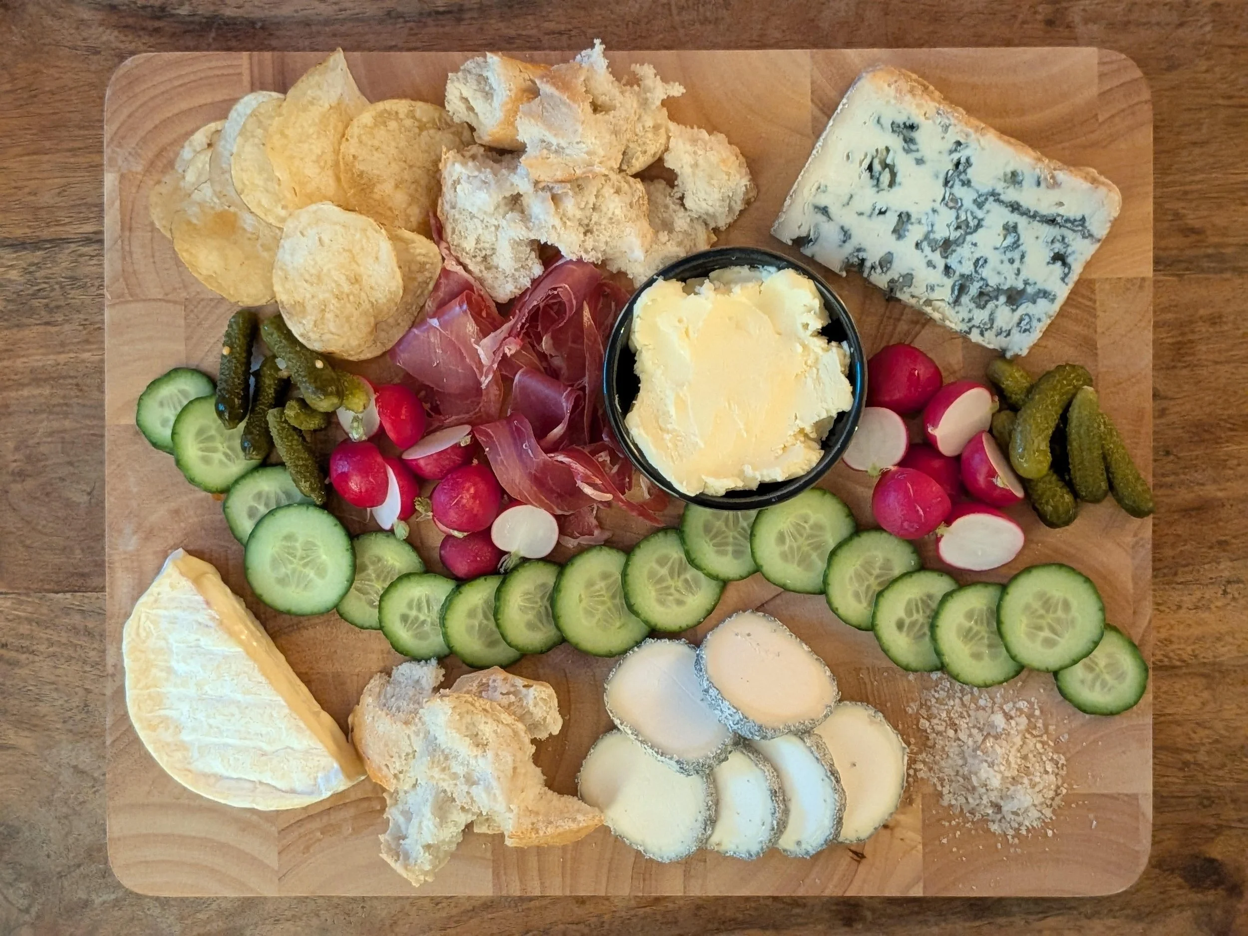 “Jams, jellies, and conserves go well with butter, and could be interesting to add along with cheese,” says Mignucci. Jambon beurre, a classic French sandwich, can be deconstructed on a cheese board with baguette, Bayonne ham, and cornichons. For an English-inflected board spread, consider the tea sandwich of butter and cucumber for inspiration.